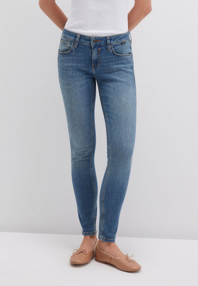 Die Jeans hat eine klassische Passform mit einer mittleren Bundhöhe. Diese sorgt für einen stützenden und bequemen Sitz, der ein Verrutschen oder Herunterrollen verhindert. Sie ist enganliegend geschnitten und betont die Figur, ohne dabei unbequem zu sein. Der Elasthananteil im Material ermöglicht eine gewisse Dehnbarkeit, wodurch sich die Jeans gut an die Körperform anpasst und Bewegungsfreiheit bietet.