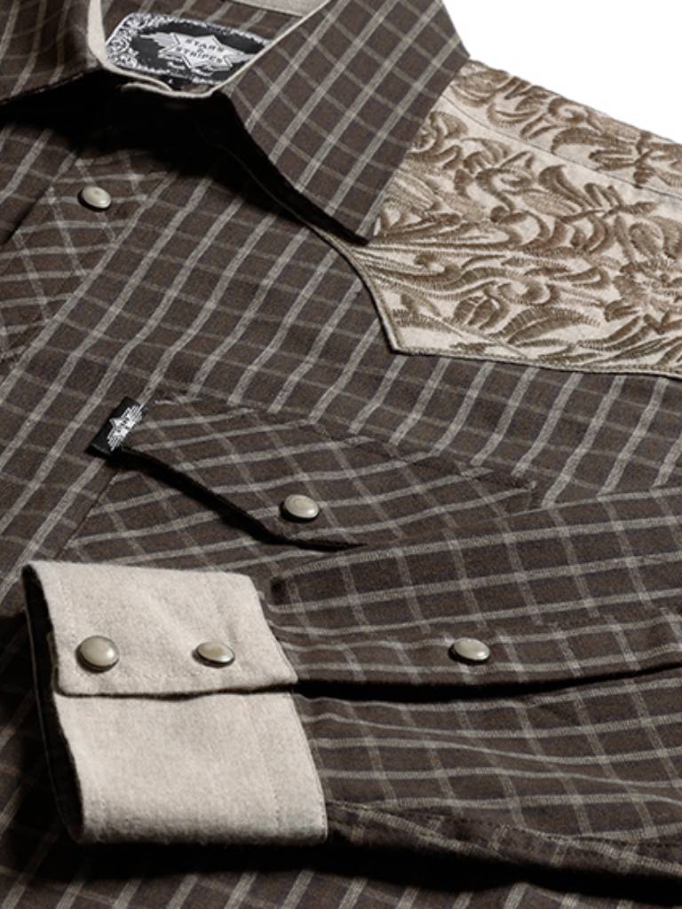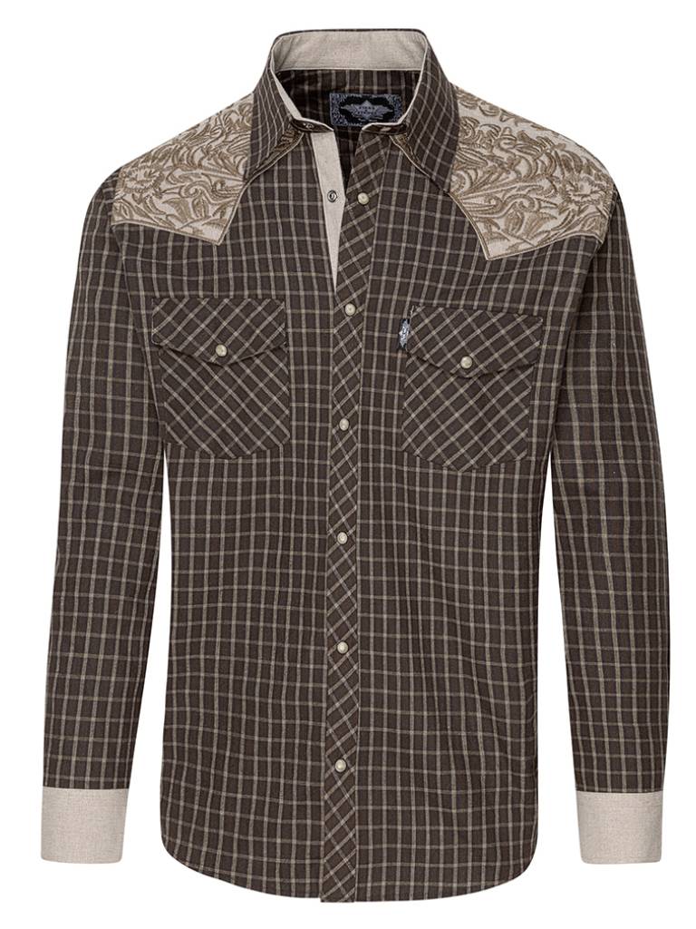 Kariertes Roger Westernhemd mit bestickter Westernpasse und Fake Smileys. Ein eingearbeiteter Stoffbesatz im Kragen umschliesst das Design. Druckknöpfe an der Knopfleiste machen es zu einem echten Hingucker. Passt optimal zu Bluse Abby.