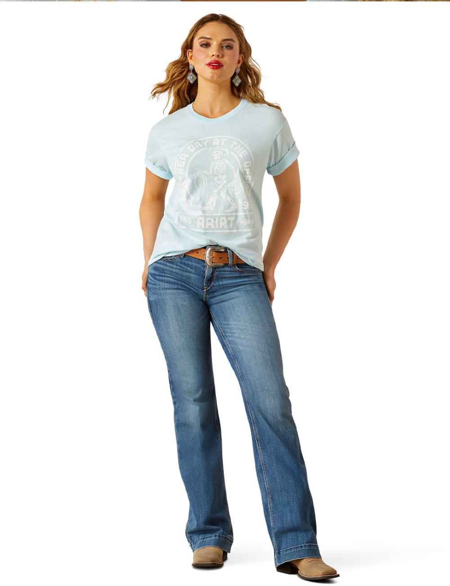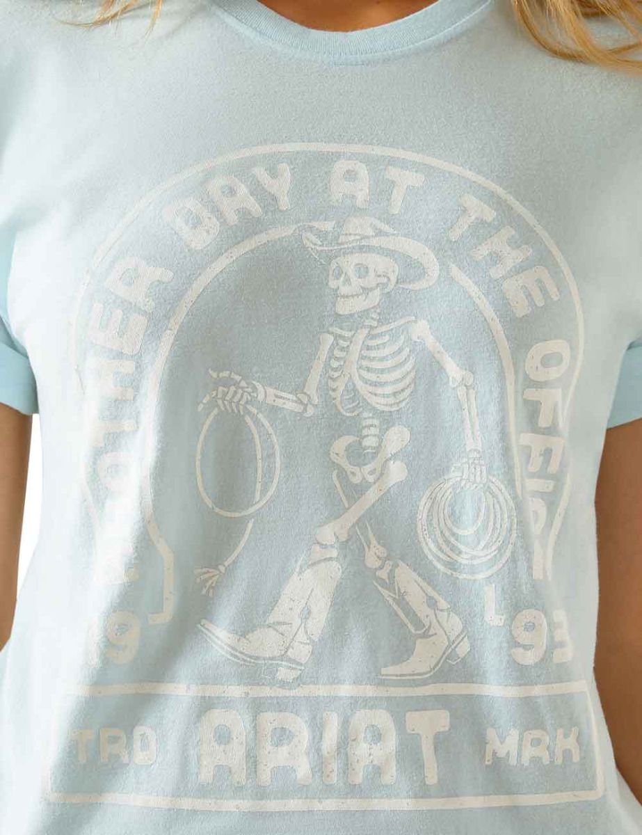 Hellblaue T-Shirt-Vintage Lagoon in sehr bequeme Boyfriend-Passform. Mit grafischem Druck zu erkennen, der eine Skelettfigur mit Cowboyhut, Stiefeln und einem Lasso zeigt.