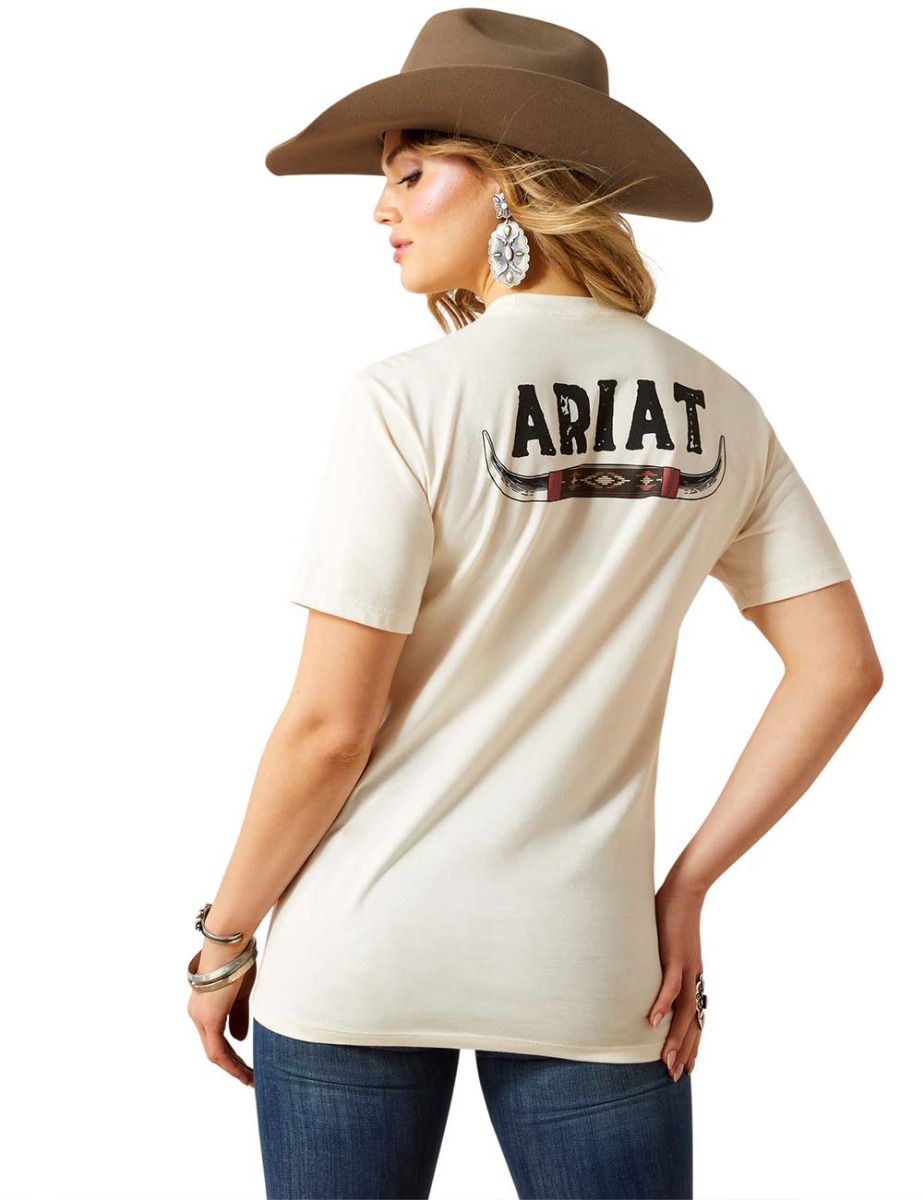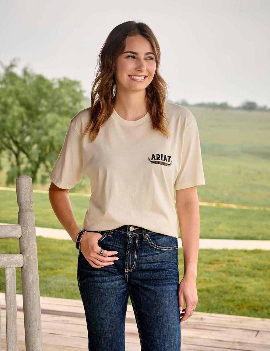 Hellblaue T-Shirt-Vintage Lagoon in sehr bequeme Boyfriend-Passform. Mit grafischem Druck zu erkennen, der eine Skelettfigur mit Cowboyhut, Stiefeln und einem Lasso zeigt.