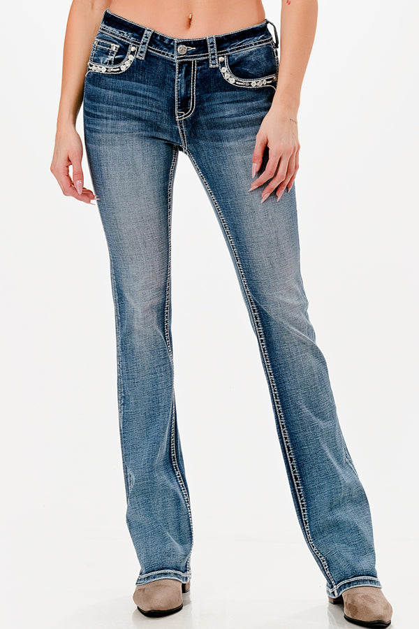 Diese Grace Jeans vereint modernes Design mit klassischem Western-Flair. Die wunderschöne Stickerei auf den Gesäßtaschen, in Form eines Hufeisen und die Verzierungen auf den Vordertaschen setzen coole Akzente.